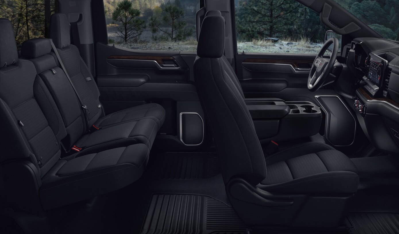 The Sierra EV provides ample storage options throughout the cabin, including a center console with multiple USB ports and both 12V and 120V power outlets. Features like the 14-inch multicolor Head-Up Display and Bose premium audio systems enhance the driving experience for everyday use and long trips.